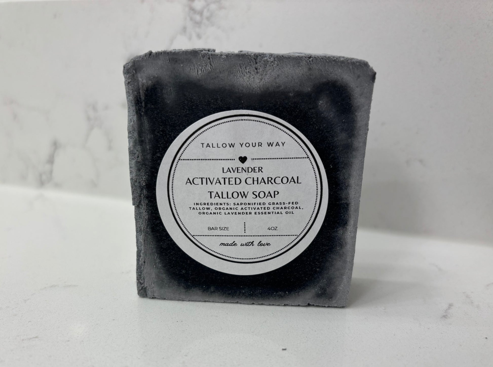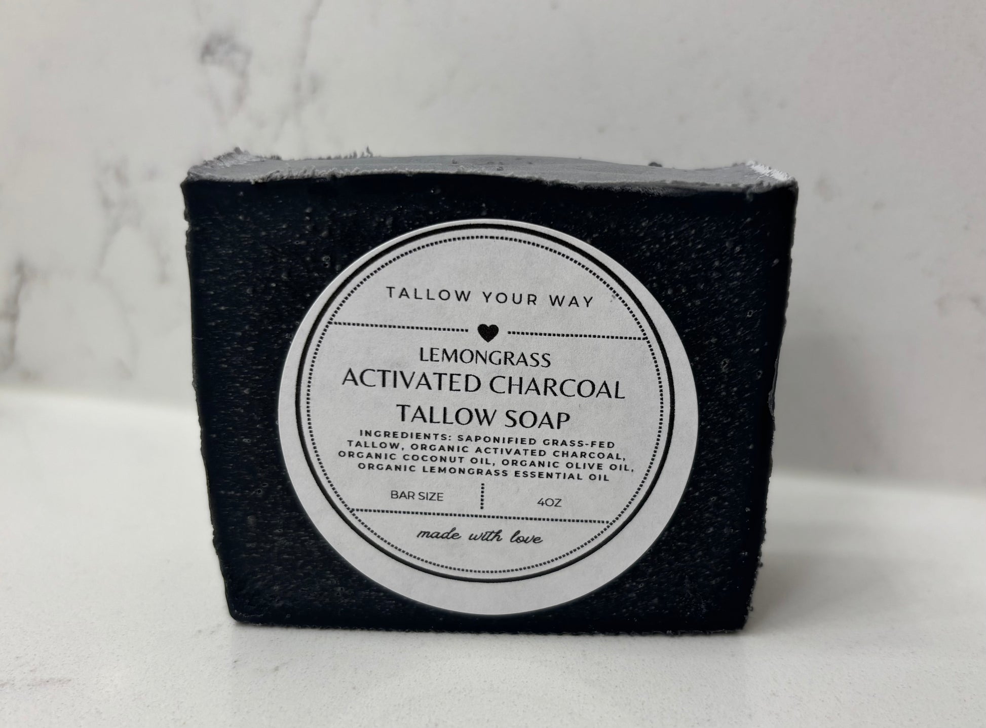 UNSCENTED & TEA TREE INGREDIENTS: Saponified Grass-Fed Tallow, organic activated charcoal, organic coconut oil, organic olive oil, With or Without organic essential oil blend